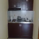 Die Unterkunft verfügt über eine Küchenzeile mit Einrichtungen wie einem Wasserkocher, einem Kühlschrank und Küchenutensilien. Die Gäste sind eingeladen, auf einer Terrasse zu entspannen.